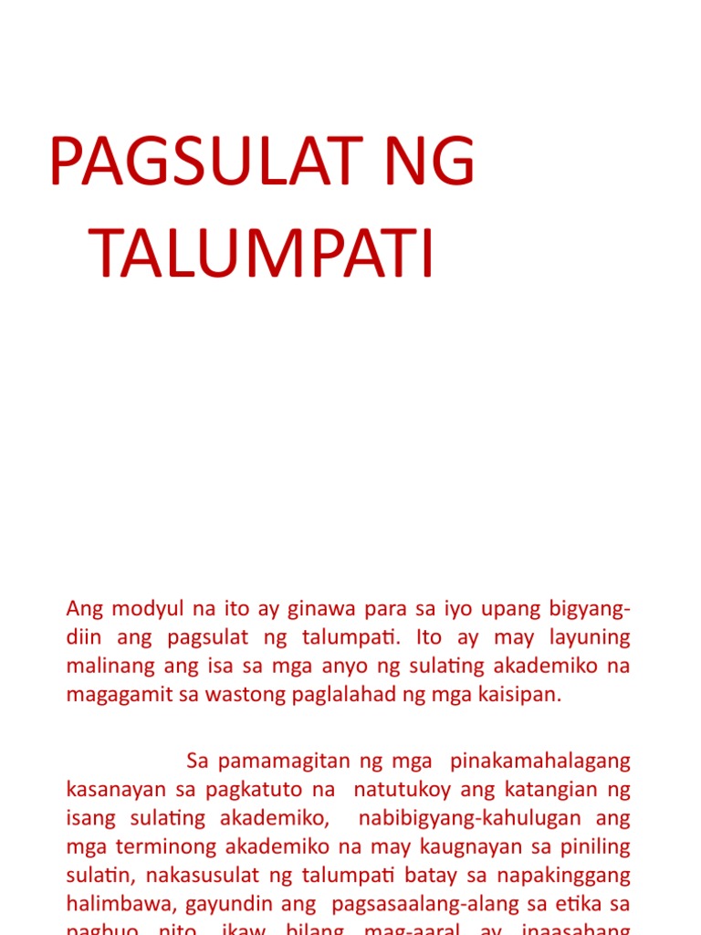 TALUMPATI IntroduksyonPanimula-Paghahanda sa mga nakikinig para sa nilalaman ng talumpati kaya dapat angkop ang pambungad. Talataan sintaks pagpili ng mga salita ispeling bantas at gamit ng malaking titik at kabuuan. Ito ang hakbang na maghanda sa manunulat bago niya buuin ang burador.