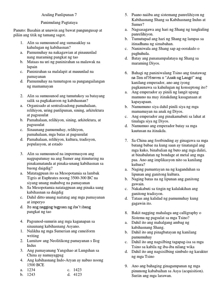 Maayos ang mga grid-patterned na kalsada D. 2 question Sistema ng pagsulat na nagsisilbing tagapag -isa ng tsino. Dahil ito ang mahalagang ambag ng kabihasnang Shang b.