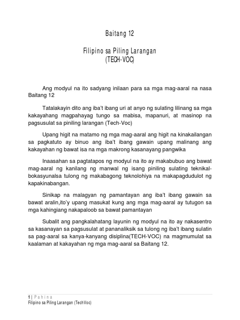 Kahit na sa daigdig ng cyberspace ng mga babasahin tungkol sa larangang pangkabuhayan at mga iba pang may kinalaman sa negosyo at kalakal Filipino pa rin ang iiral at mangungunang wika ngayon at sa darating pang panahon aniya pa. AKADEMIK K TO 12 BASIC EDUCATION CURRICULUM SENIOR HIGH SCHOOL APPLIED SUBJECT 12 STEM AND 12 ABM BAHAGI 1. I Filipino sa Piling Larang Tech-Voc Patnubay ng Guro Kagawaran ng Edukasyon Republika ng Pilipinas Ang aklat na ito ay magkatuwang na inihanda at sinuri ng mga edukador mula sa mga publiko at pribadong paaralan kolehiyo at o unibersidad.