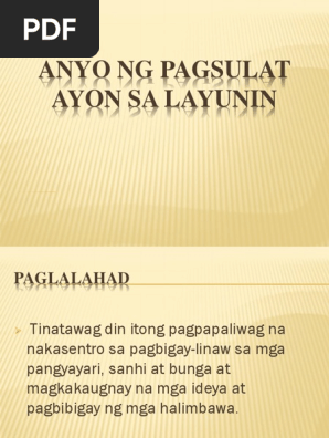 AYON SA LAYUNIN PAGLALAHAD Tinatawag din itong pagpapaliwag na nakasentro sa pagbigay-linaw sa mga pangyayari sanhi at bunga at magkakaugnay na mga ideya at pagbibigay ng mga halimbawa. Ayon sa Layunin REGULATORY O SPECIAL TAX Ipinapataw upang maisaayos ang paggamit o pagkonsumo ng produkro Halimbawa. Maaari din namang magbigay papuri ang isang talumpati.