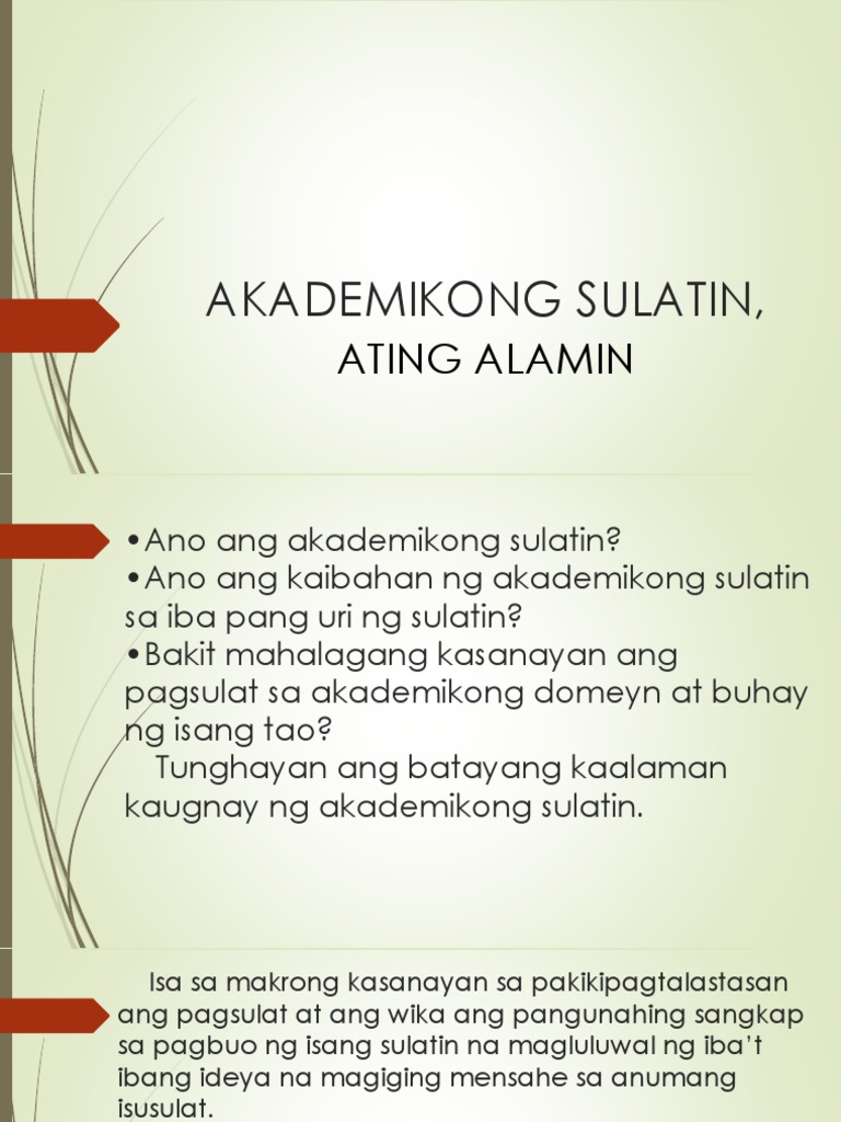 1999 Sa kontemparanyang paahon ay hindi na lamang sapat ang kakopyahan sa pagbasa at pagsulat upang maging literate Ayon sa International Reading Association. Kahulugan ng Pagsulat Ang pagsulat ay isang paraan upang ang kaisipan ng isang tao ay kanyang maipahayag sa pamamagitan ng mga simbolo. AKADEMIKONG PAGSULAT KAALAMAN Isang makrong kasanayan sa pakikipagtalastasan ang pagsulat at ang wika ang pangunahing sangkap sa pagbuo ng isang sulatin na magluluwal ng ibat ibang ideya na magiging mensahe sa anumang isusulat.