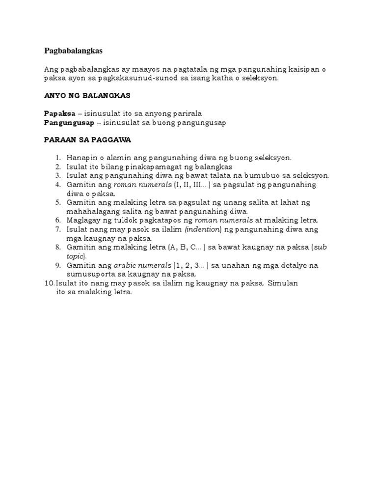 Description This material contains activities aimed to sharpen learners skill in writing outlines. ANYO NG BALANGKAS Papaksa isinusulat ito sa anyong parirala Pangungusap isinusulat sa buong pangungusap PARAAN SA PAGGAWA 1. Muling pag-iisip at muling pagsult kung kinakailangan.