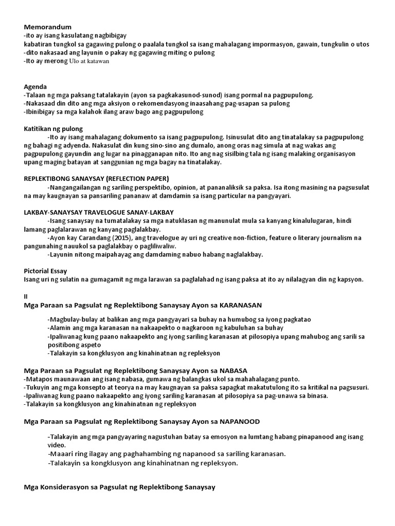 Gamit ang sulating ito natutuklasan ang sariling pag-iisip damdamin o opinyon tungkol sa isang paksa pangyayari o tao at kung paano naaapektuhan ng mga ito. Pagsulat ng sanaysay. May ibat-ibang uri ang akademikong sulatin at ito ay ang abstrak sintesis bionote memorandum agenda panukalang proyekto talumpati katitikan ng pulong replektibong sanaysay pictorial essay lakbay sanaysay at posisyong papel.