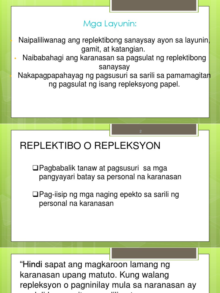 Ang Replektibong sanaysay ay isang uri ng panitikan na. Binibigyang-diin dito ang impormasyong gustong ibigay at ang argumento sa mga ideya na sumusuporta sa paksa Alejo et al 2005. Alam niyo na ang kahulugan ng tradisyunal na sanaysay na ayon sa nakasulat ito ay naglalaman ng madalas ng mga pananaw kuro-kuro o opinyon ng isang awtor o akda.