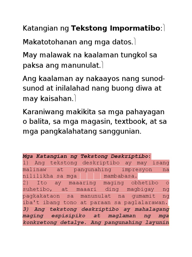 Mga imporasyon sa katangian ng tao bagay lugar at pangyayari. Minsan isang tanghalian habang ako ay teacher prefect sa aking mga mag-aaral naitanong sa akin ng isa kong estudyante kung bakit pa raw niya pag-aaralan ang Filipino kung magiging CEO naman siya ng kanilang kumpanya balang-araw. Sa pagsulat din ang siyang paraan upang mag pa blater ng mga masasamang tao sa lipunan.