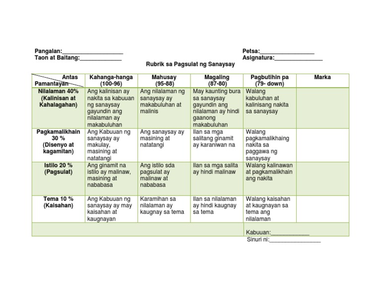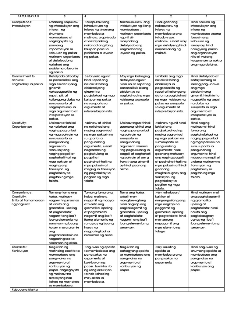 Rubriks Sa Pagsulat Ng Sanaysay Doc